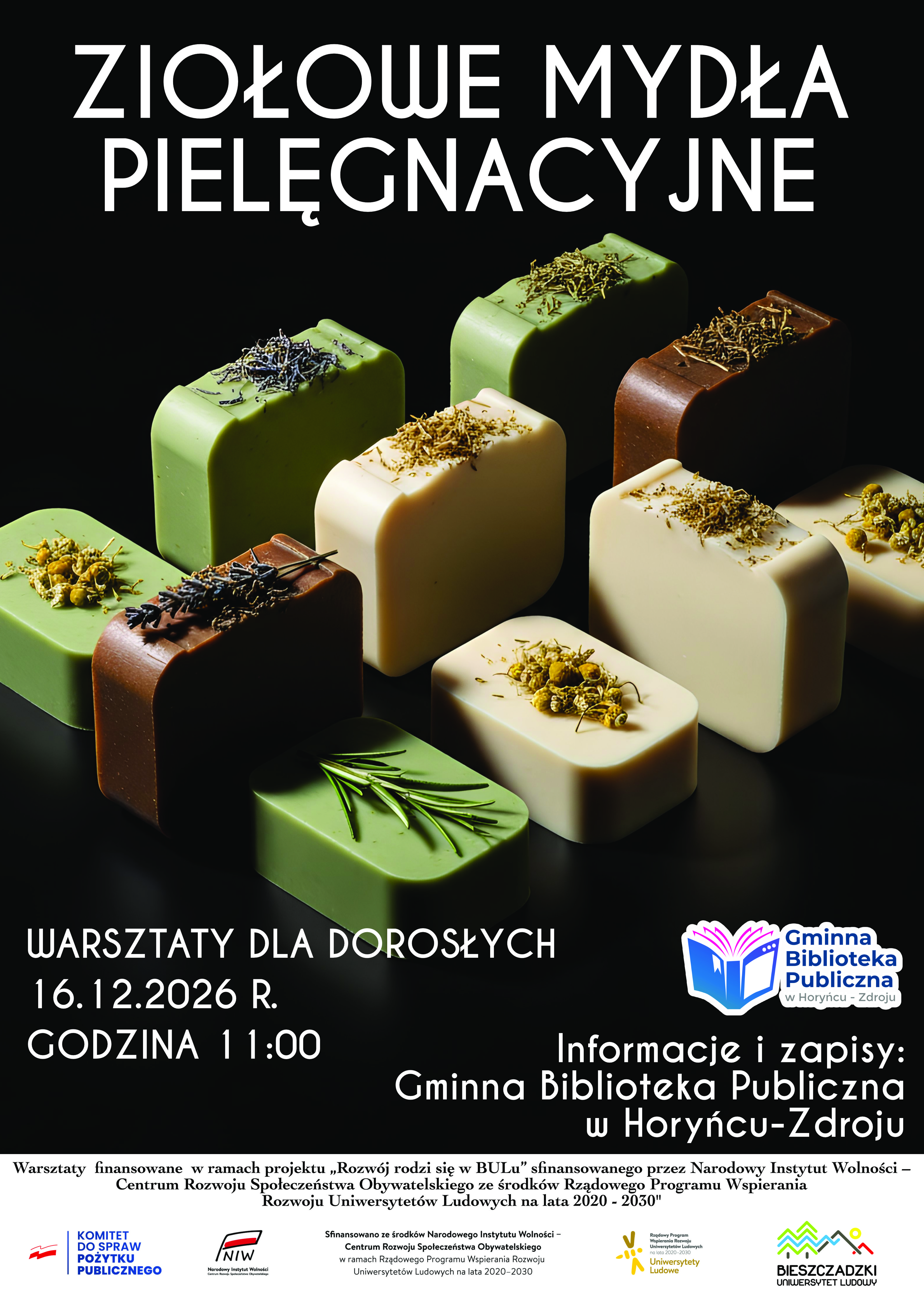 Zapraszamy na warsztaty pn.: „Ziołowe mydła pielęgnacyjne” w dniu 16 grudnia 2025 o godzinie 11:00. Warsztaty są bezpłatne.