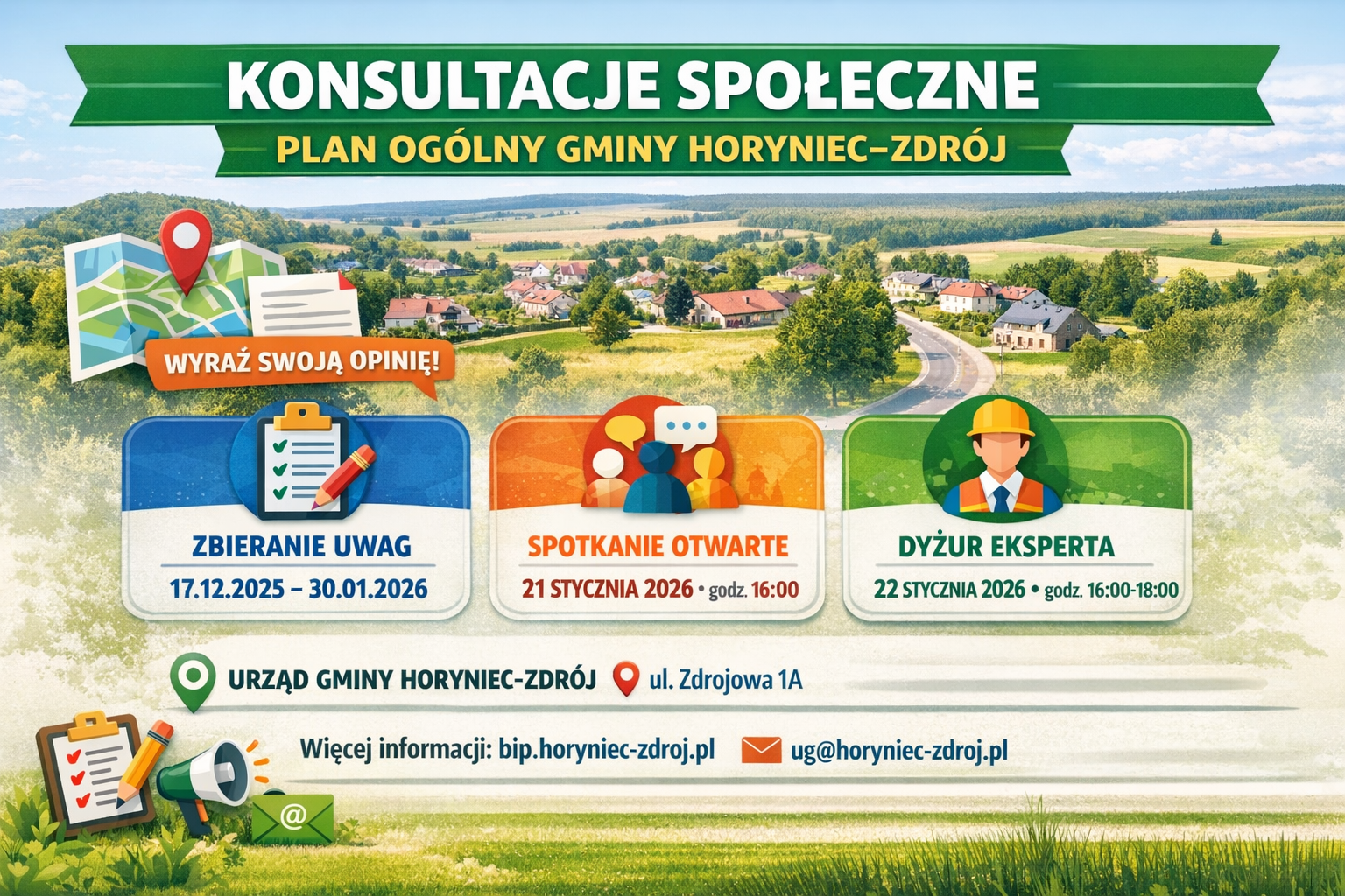 Uwagi do projektu planu ogólnego należy składać do Wójta Gminy Horyniec–Zdrój do dnia 30 stycznia 2026 r.